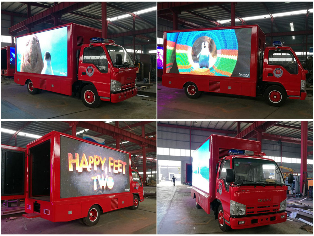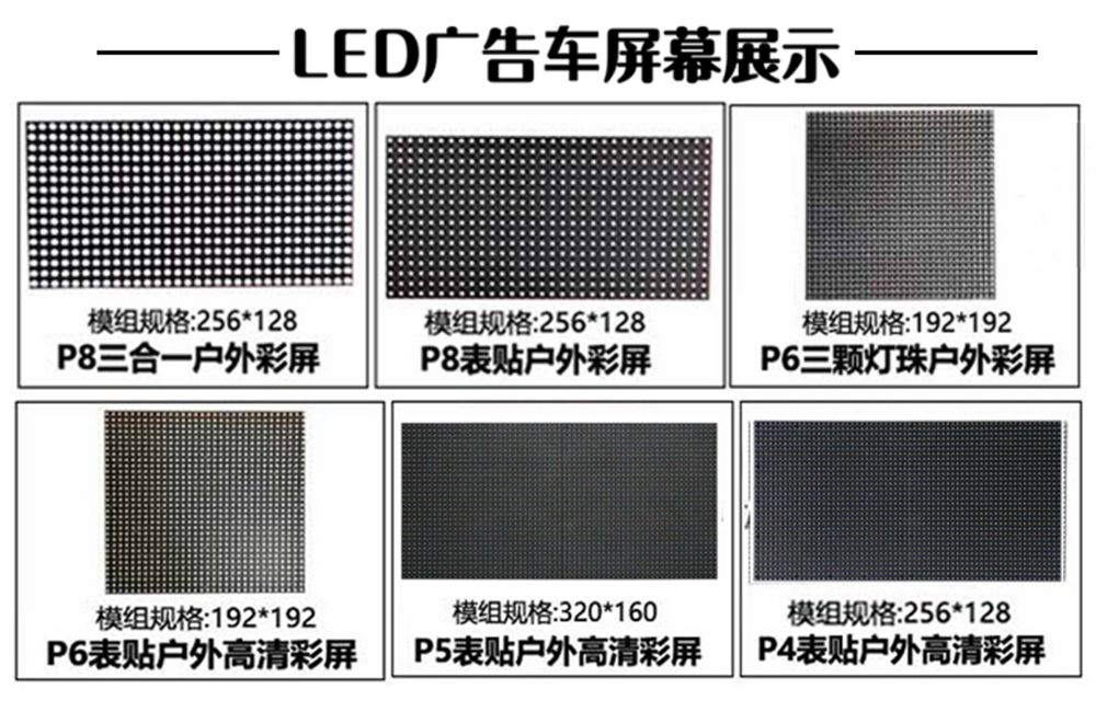 廣告車選裝配置:客戶可根據(jù)需求選裝屏幕清晰度(P10彩屏、P8彩屏、P6彩屏、P5彩屏、P4彩屏)、單面彩屏、雙面彩屏、雙